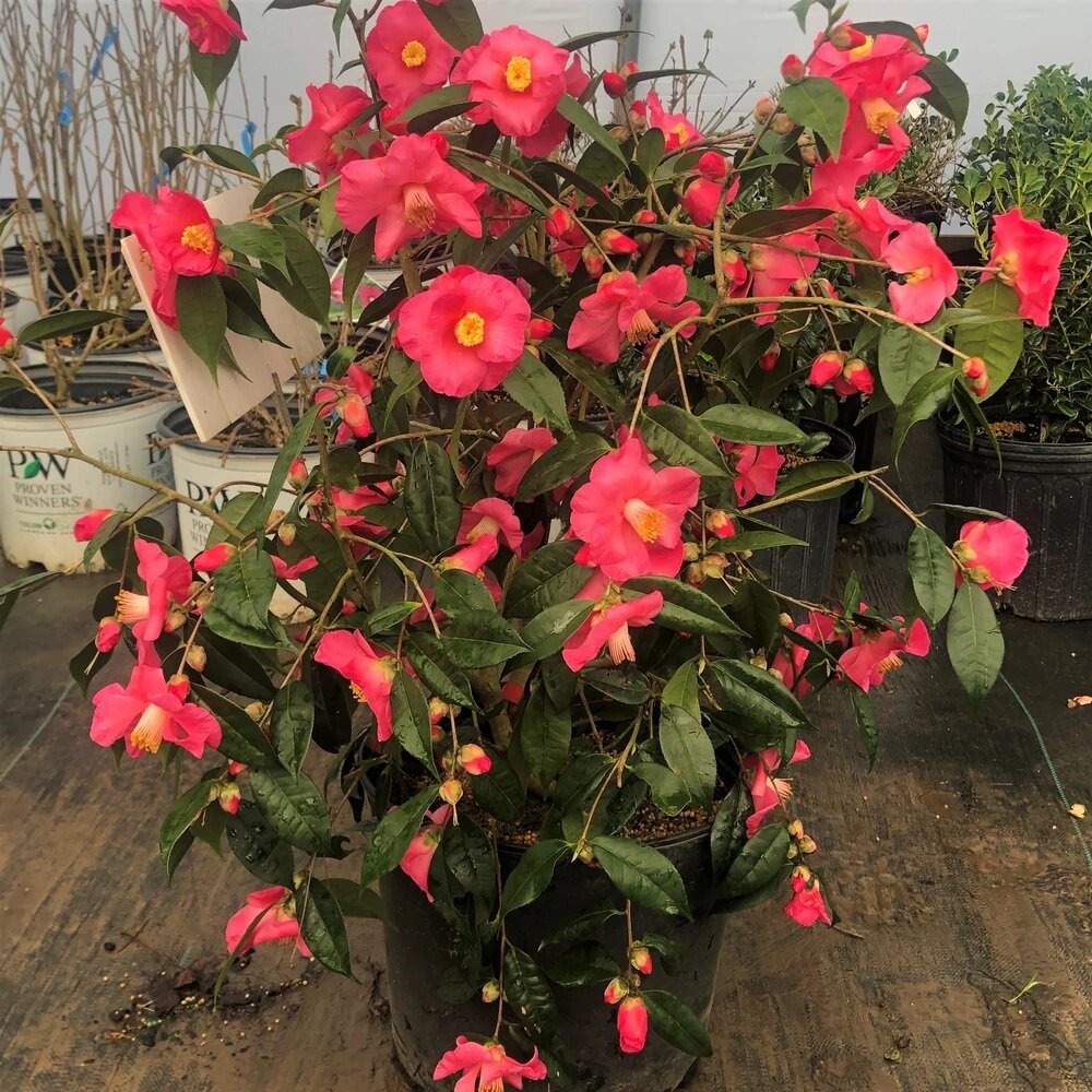 Camellia 'Crimson Candles' is an evergreen shrub known for its deep red, camellia-like blooms that appear in late winter to early spring. With its glossy dark green foliage and vibrant flowers, this variety adds color and texture to shaded or partially shaded garden spaces.