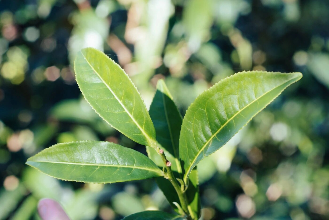The Tea Plant, Camellia sinensis, is the source of green, black, and oolong teas. This evergreen shrub has glossy green leaves and delicate white flowers that bloom in late fall. Grown for its leaves, it requires a warm climate with acidic, well-drained soil.