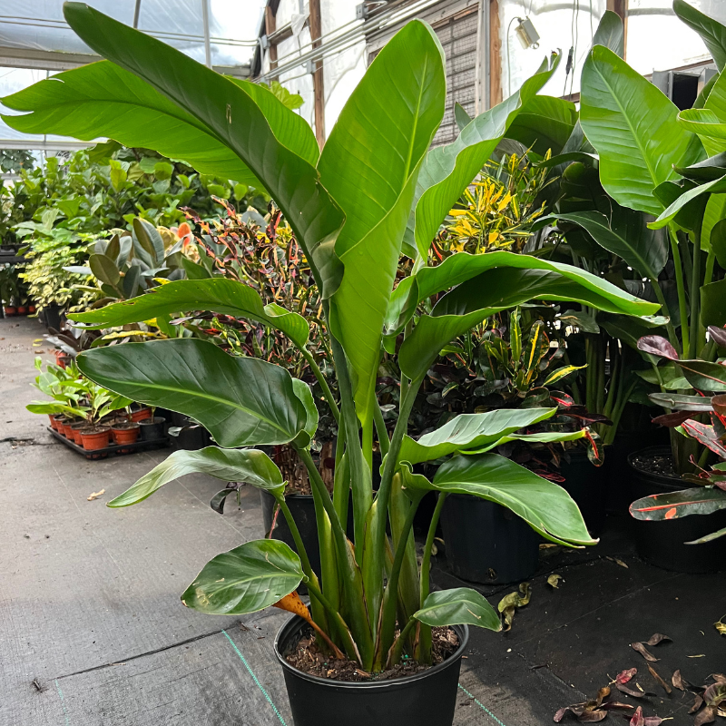 A delightfully easy-care plant, the Bird of Paradise has large, upright, grey-green paddle-shaped leaves and when they are happiest in high light, they will produce orange, red, and blue flowers that resemble a bird flying.