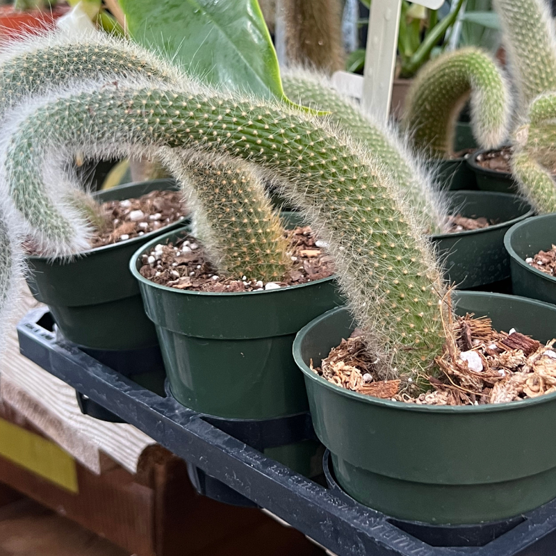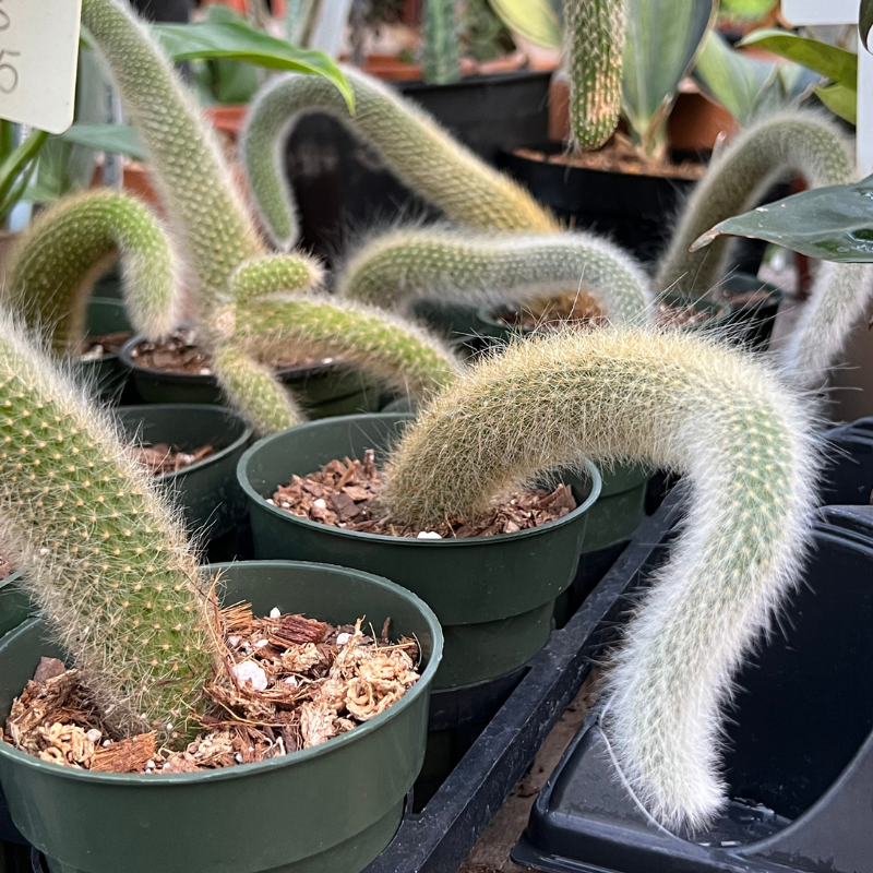 The Monkey Tail Cactus is highly sought after for its easy care and ornamental qualities. Stems are covered with soft spines and strands of white hair, giving it a furry appearance. As this plant matures, its stems will sprawl and hang – ideal for a hanging basket.