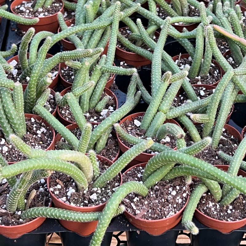 A trailing cactus with long, slender stems and bright pink tubular flowers in spring. Ideal for hanging baskets.