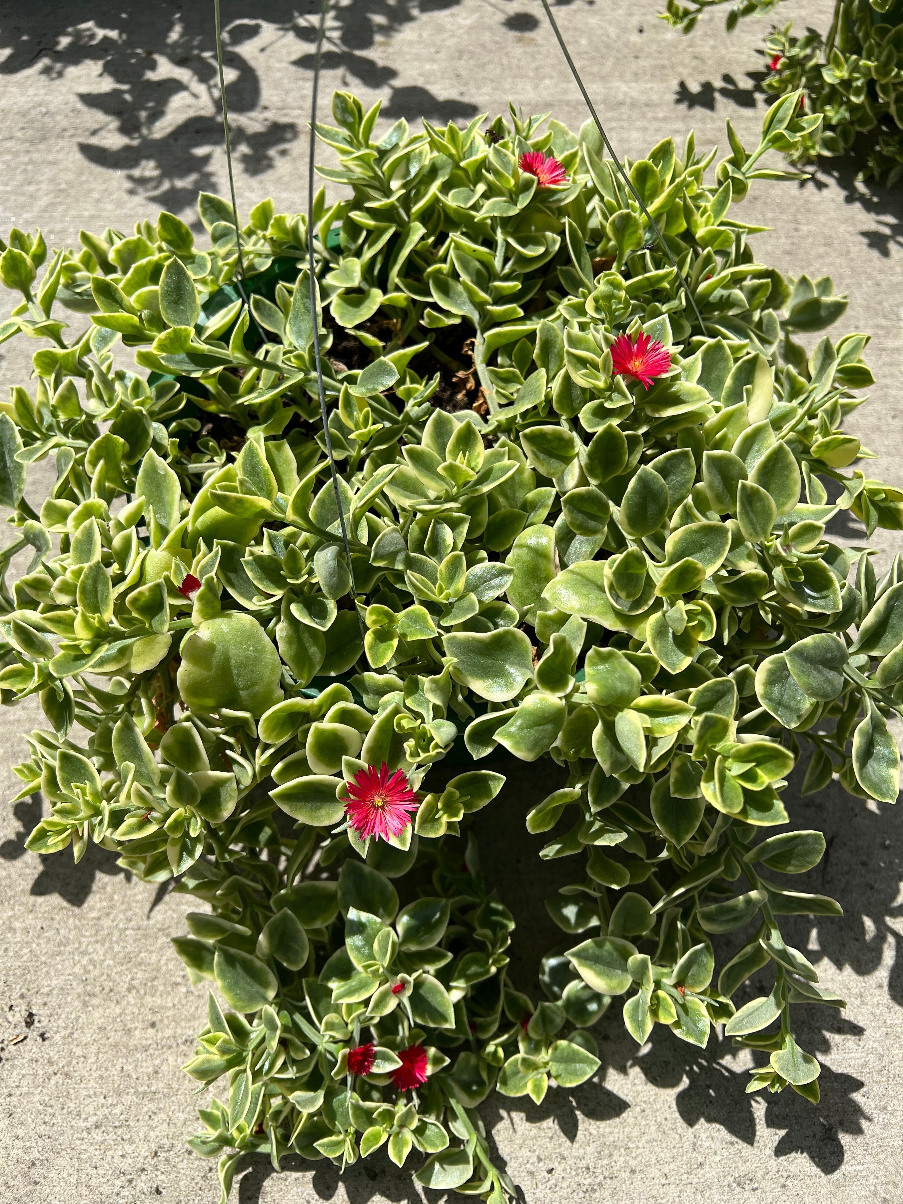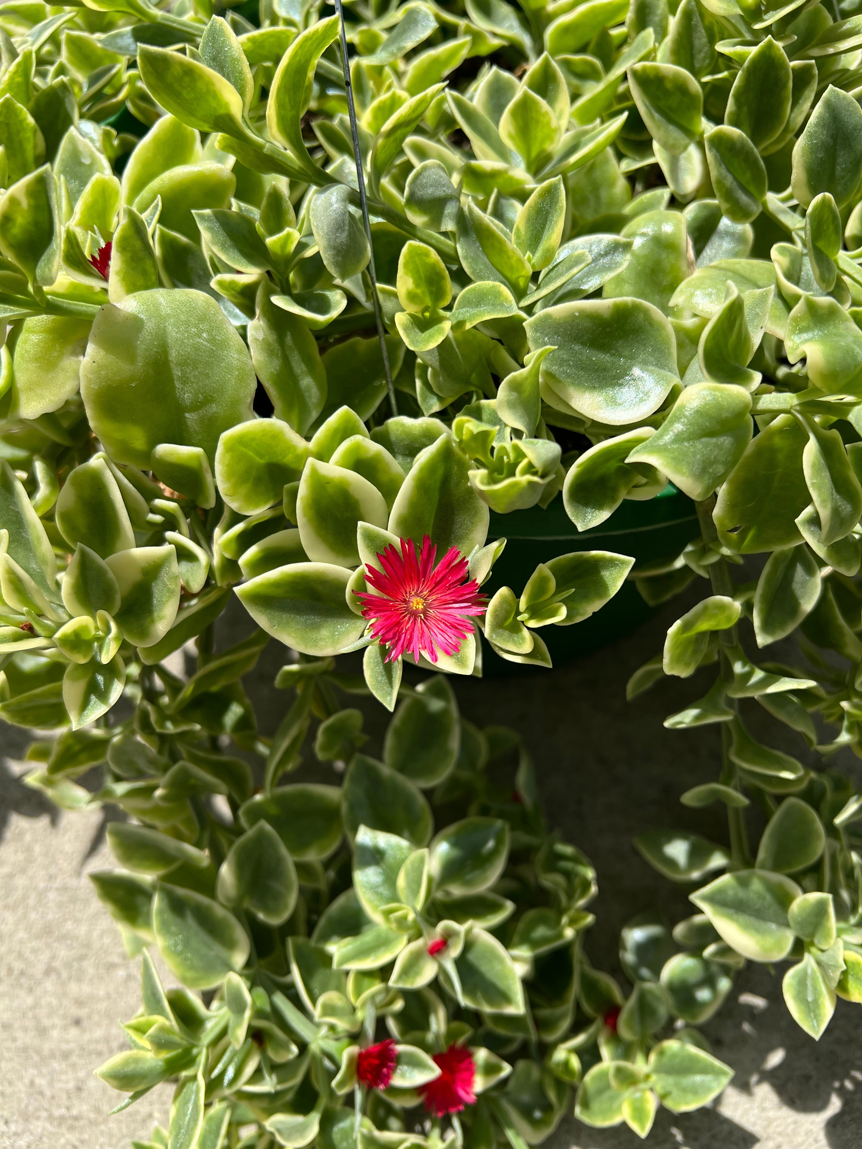 This heat-tolerant trailing succulent combines glossy green foliage edged in cream with vivid red daisy-like blooms. Ideal for hanging baskets, containers, or ground cover, Mezoo thrives in warm weather and requires minimal care.