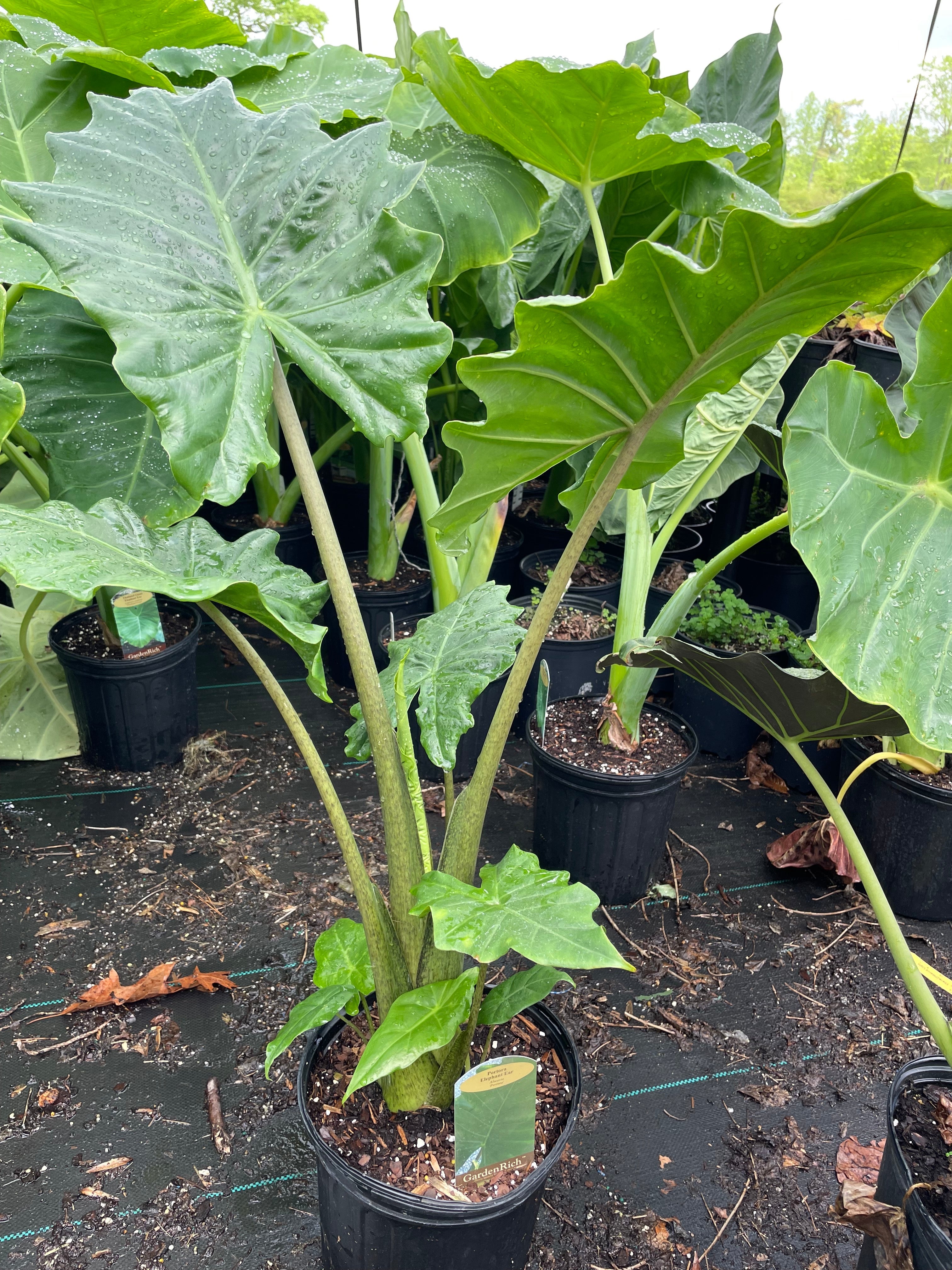 Portora Elephant Ear is a striking hybrid known for its massive, deeply ribbed leaves held on tall, sturdy stems. With its bold, upright form and tropical appeal, it makes a powerful statement in large containers or landscape beds.
