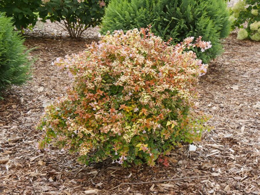 Frosty Glossy Abelia is a compact, semi-evergreen shrub featuring glossy green leaves edged in creamy white and small, fragrant white flowers that bloom from summer into fall. Its colorful foliage and long blooming season make it ideal for borders and low hedges.