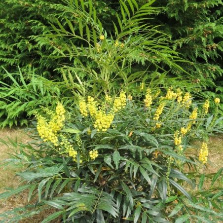 Grape Holly is a rugged, evergreen shrub native to North America, known for its holly-like foliage, bright yellow spring flowers, and deep blue berries that resemble grapes. Its year-round interest, shade tolerance, and wildlife value make it a favorite for woodland and naturalized plantings.