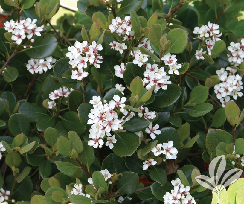 Indian Hawthorn is an evergreen shrub that produces clusters of white or pink flowers in early spring, followed by small, dark berries that attract birds. Its glossy, dark green leaves provide year-round interest, and its compact form makes it ideal for low hedges, borders, or foundation plantings.