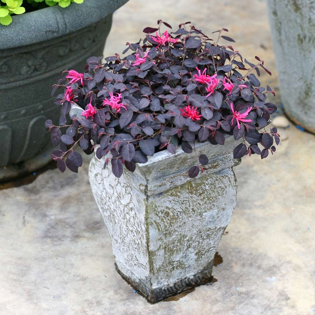 Jazz Hands Mini® Chinese Fringe Flower is a compact, mounding evergreen shrub with rich burgundy foliage and hot pink, fringe-like flowers in spring. Its tidy size and bold color make it perfect for borders, containers, and small gardens.