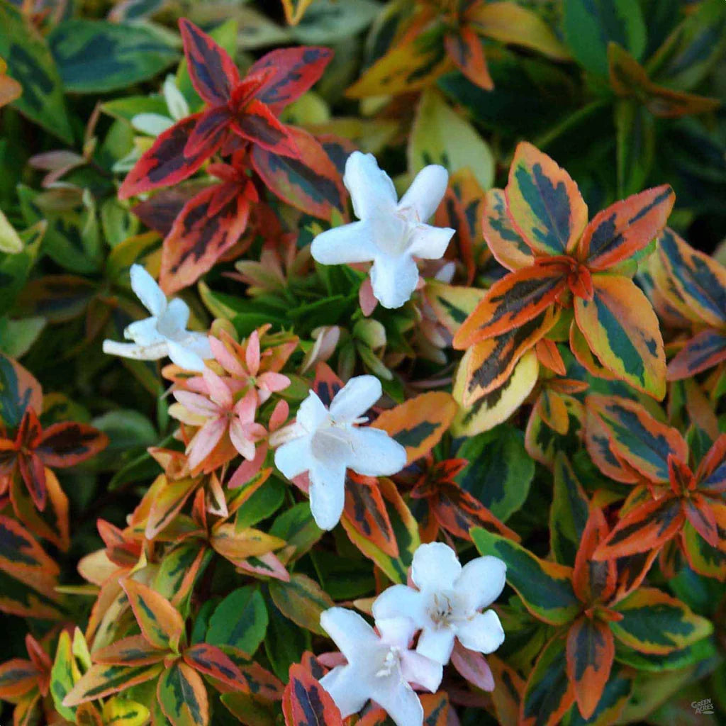 Kaleidoscope Glossy Abelia is a vibrant, low-maintenance shrub known for its striking variegated foliage that changes color throughout the seasons—gold and green in spring and summer, transitioning to orange and red in fall. It also produces small white, fragrant flowers from late spring to fall.
