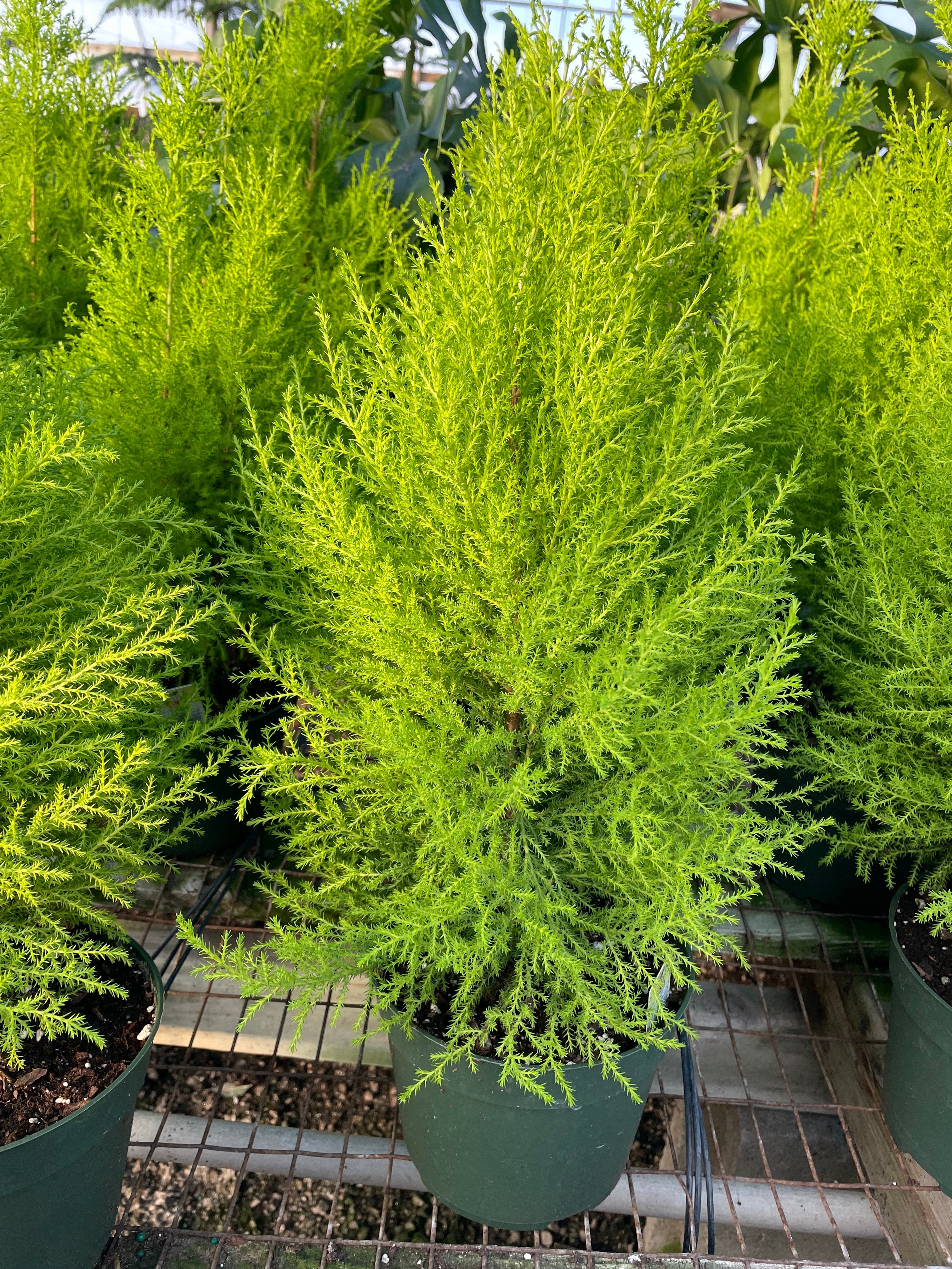 Lemon Cypress is a bright, columnar evergreen known for its vibrant chartreuse foliage and fresh citrus scent. With its compact, upright form, it adds structure and color to containers, borders, and holiday displays.