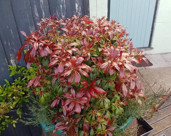 ‘Katsura’ Lily-of-the-Valley Shrub is a compact, evergreen shrub known for its cascading clusters of deep pink, bell-shaped flowers in early spring and its vibrant red new foliage that matures to glossy green. It offers year-round interest and thrives in partially shaded gardens.