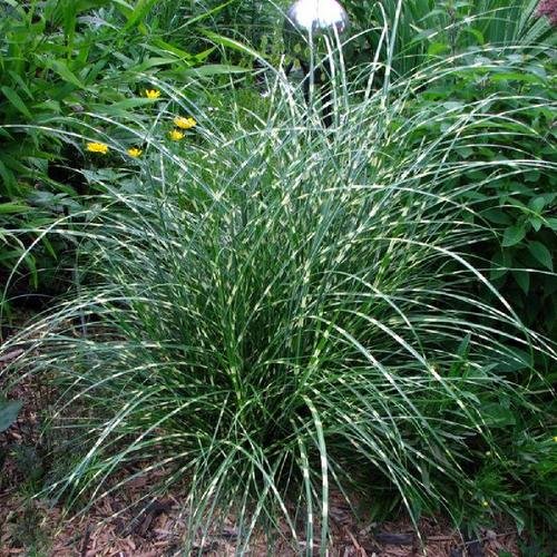 Little Zebra Grass is a dwarf ornamental grass prized for its striking horizontal gold banding on green foliage and its compact, upright habit. In late summer, fluffy reddish-purple plumes rise above the foliage, aging to silvery-tan and adding winter interest.