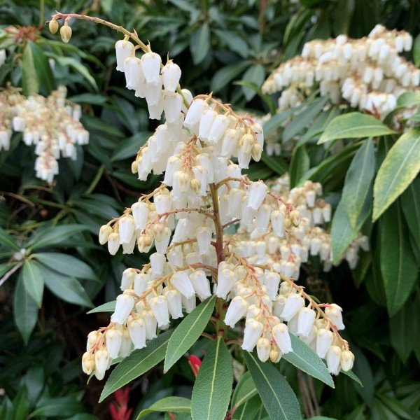 Temple Bells Pieris is an elegant, evergreen shrub prized for its cascading clusters of large, creamy white, bell-shaped flowers that bloom in early spring. Its dark green foliage and upright form make it a refined choice for woodland gardens and shaded foundations.