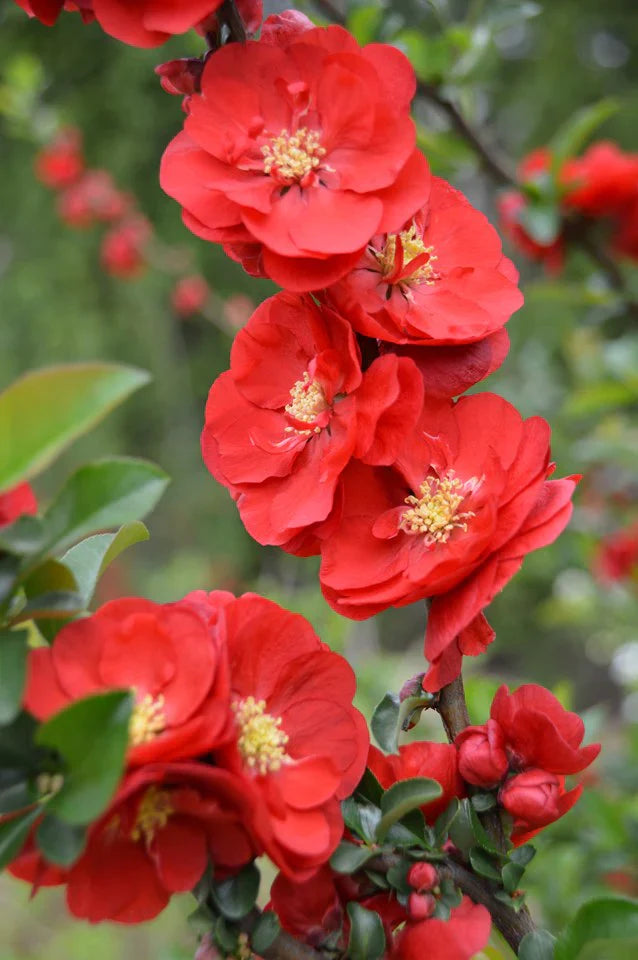 Texas Scarlet Flowering Quince is a compact, deciduous shrub that bursts into bloom in early spring with brilliant scarlet-red flowers. Its dense, thorny branches make it an excellent choice for low hedges, barriers, or early-season color in the landscape.