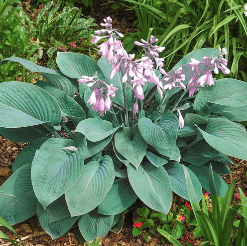 A compact hosta with steel‑blue heart‑shaped leaves and pale lavender flowers. Its small size makes it perfect for edging or containers.