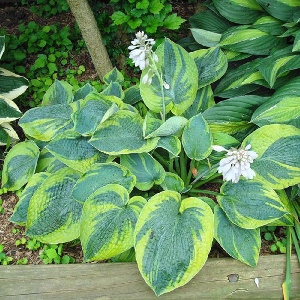 A classic variegated hosta with wide, gold-centered leaves edged in green and lavender flowers. Dramatic in shade landscapes.