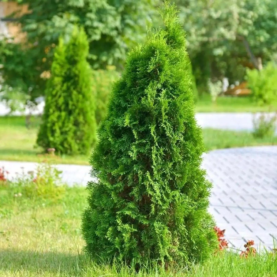 'Emerald Green' Arborvitae is a tall, narrow evergreen with vibrant green foliage that holds its color throughout the year. Its upright, pyramidal shape and slow growth make it an excellent choice for privacy screens, hedges, and formal landscaping.